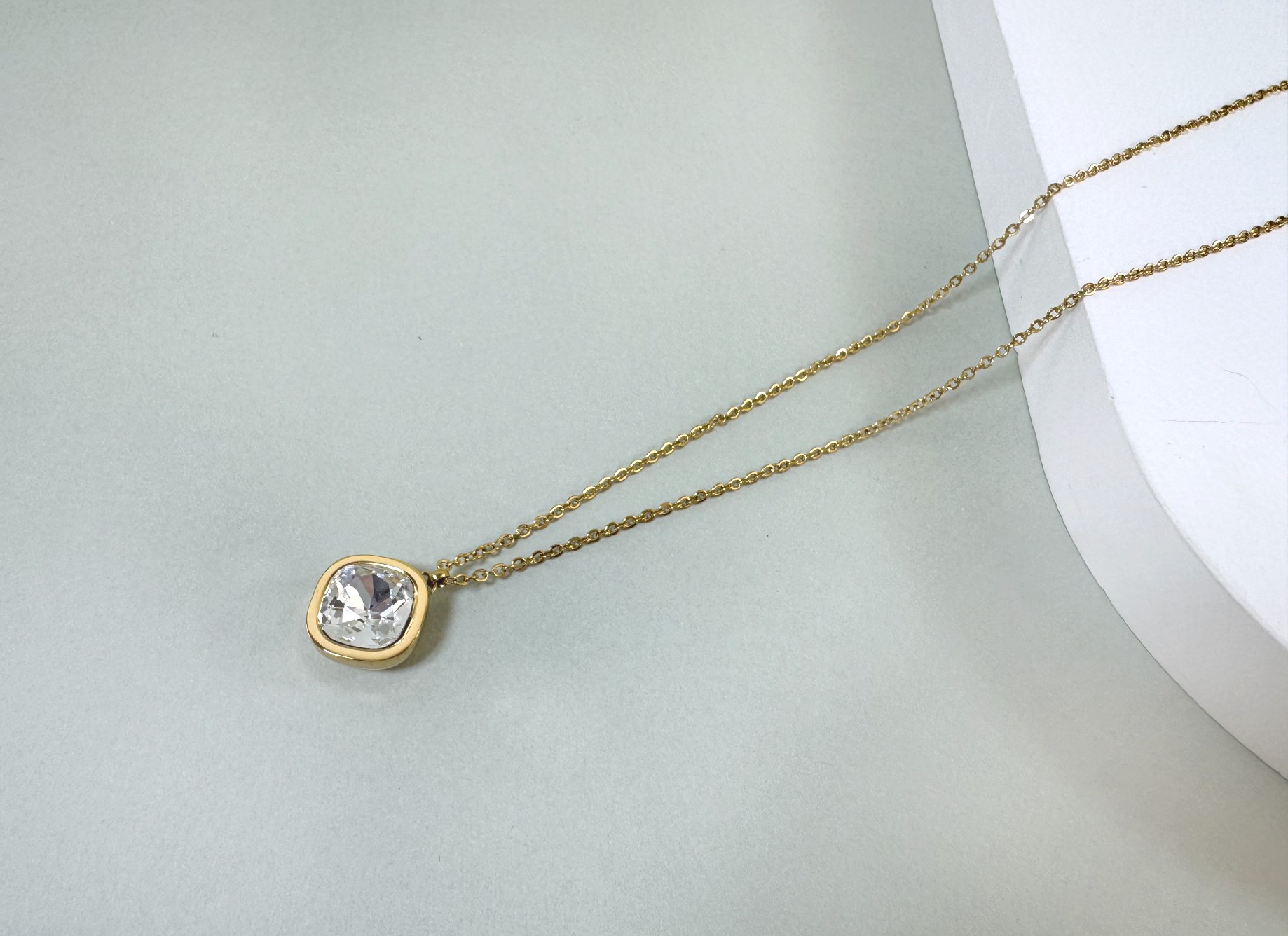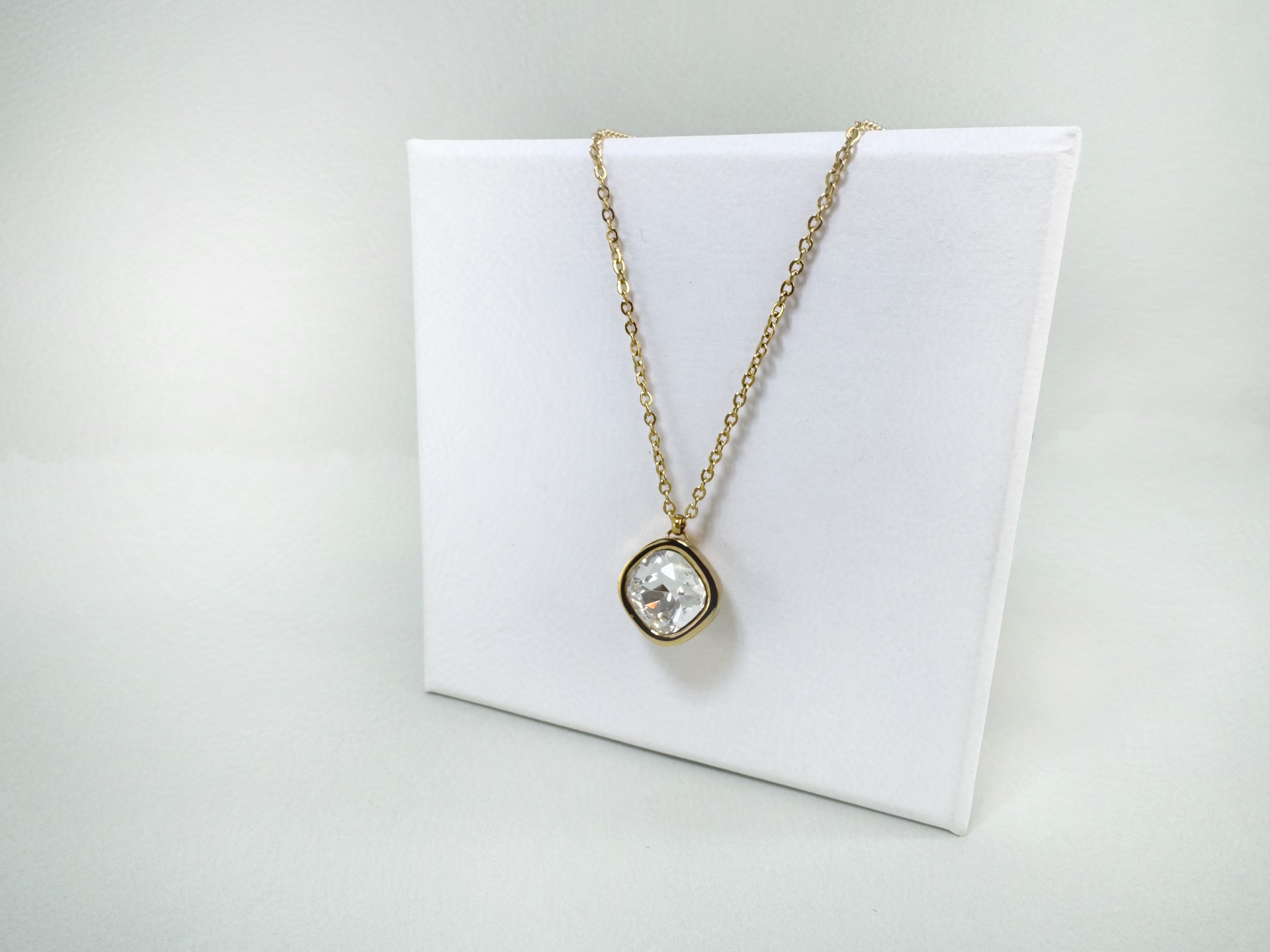 Αναδείξτε τη διαχρονική κομψότητα με αυτό το εκλεπτυσμένο χρυσό ατσάλινο κολιέ. Διαθέτει μια λεπτή αλυσίδα που αγκαλιάζει διακριτικά τον λαιμό και ένα τετράγωνο, διάφανο ζιρκόν σε μεταλλικό πλαίσιο, προσθέτοντας μια λαμπερή πινελιά στο στυλ σας. Ιδανικό για καθημερινές και βραδινές εμφανίσεις, συνδυάζεται εύκολα με κάθε look, προσφέροντας διακριτική λάμψη και κομψότητα.