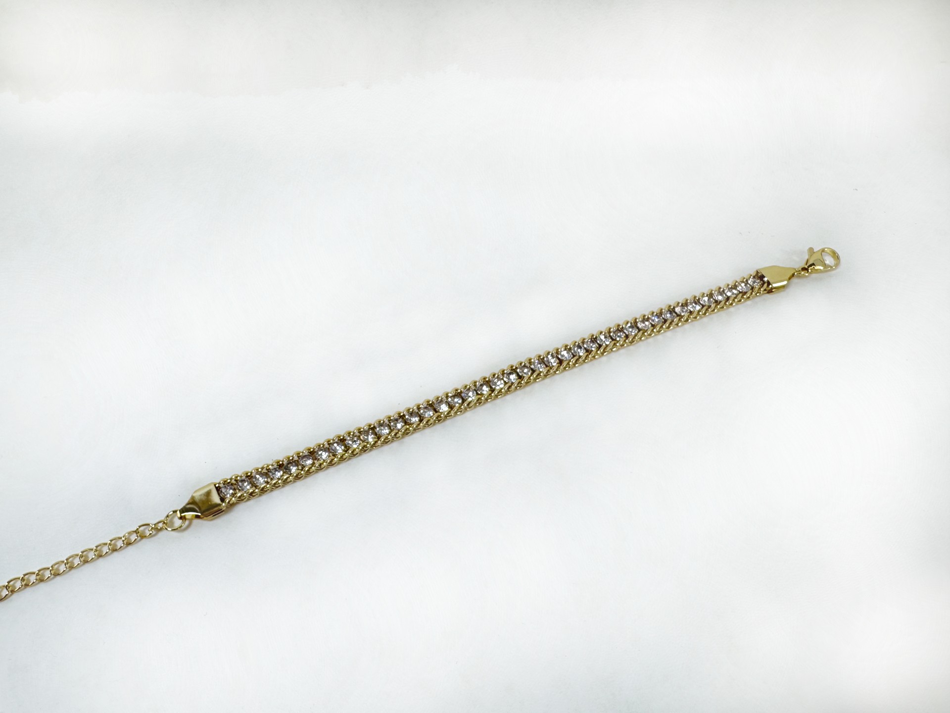 Η διπλή αλυσίδα δημιουργεί μια κομψή, πολυεπίπεδη υφή γύρω από τον καρπό, ενώ η εντυπωσιακή σειρά από λαμπερά κρύσταλλα στο κέντρο χαρίζει εκθαμβωτική φωτεινότητα.