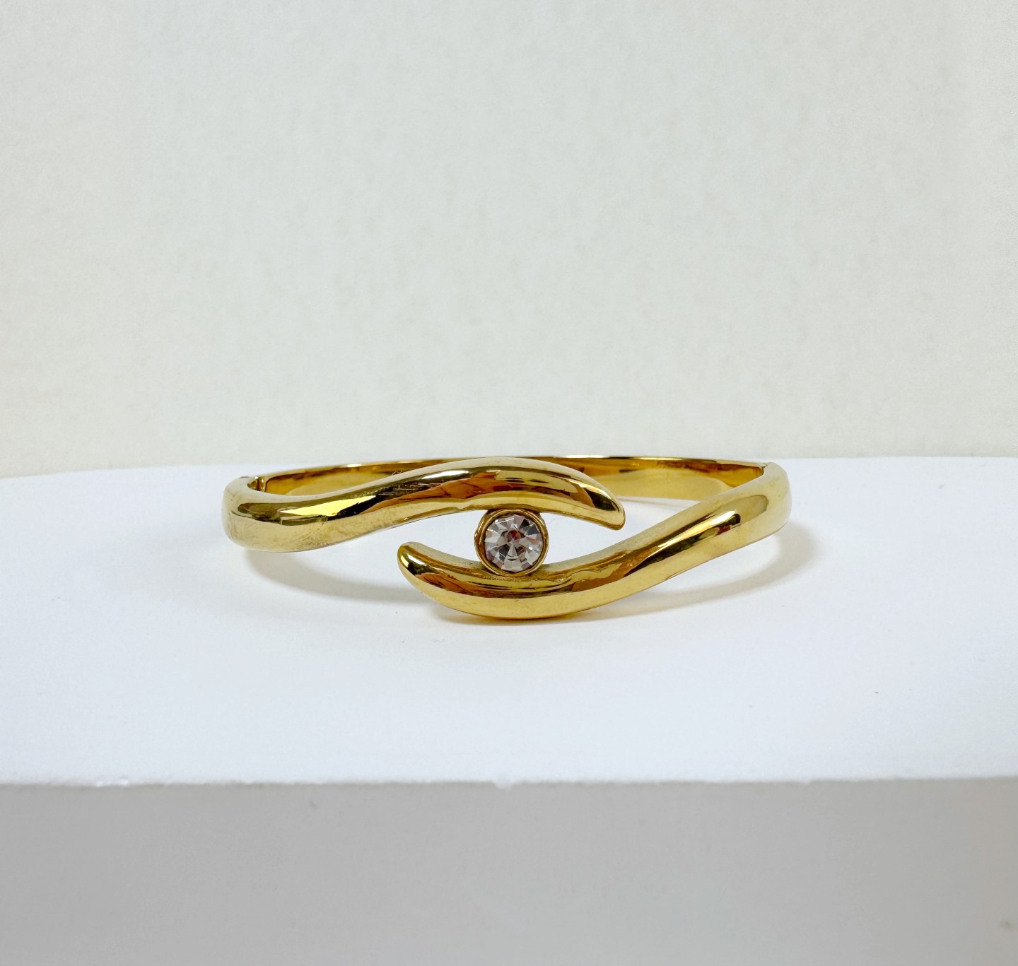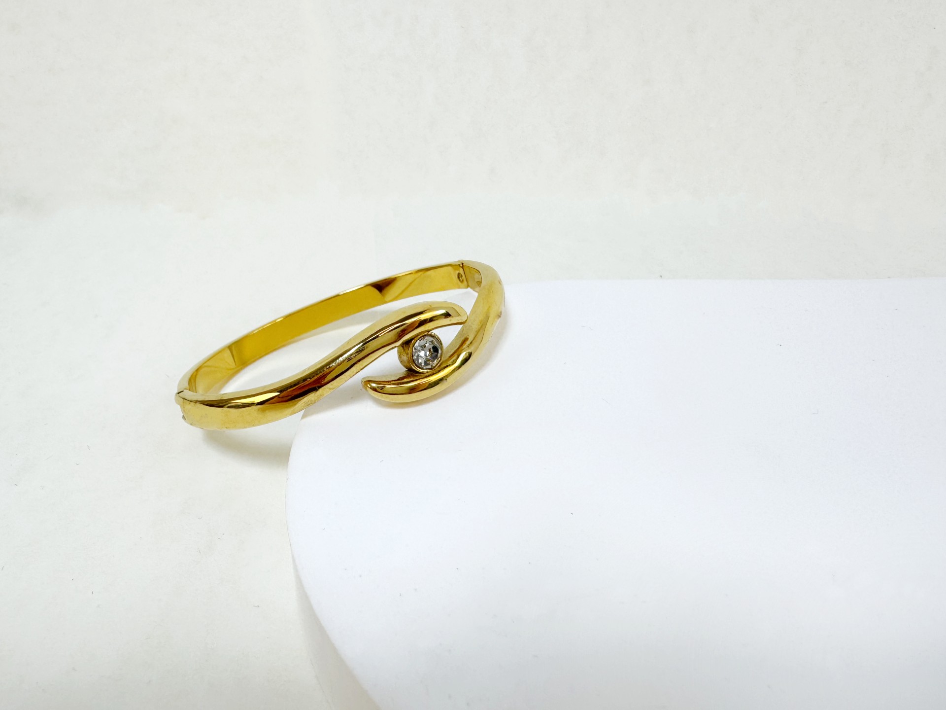 Ο γλυπτικός του σχεδιασμός αγκαλιάζει τον καρπό με αρμονία, ενώ το λαμπερό στρας στο σημείο ένωσης προσθέτει μια φωτεινή λεπτομέρεια που τραβά το βλέμμα χωρίς υπερβολές.