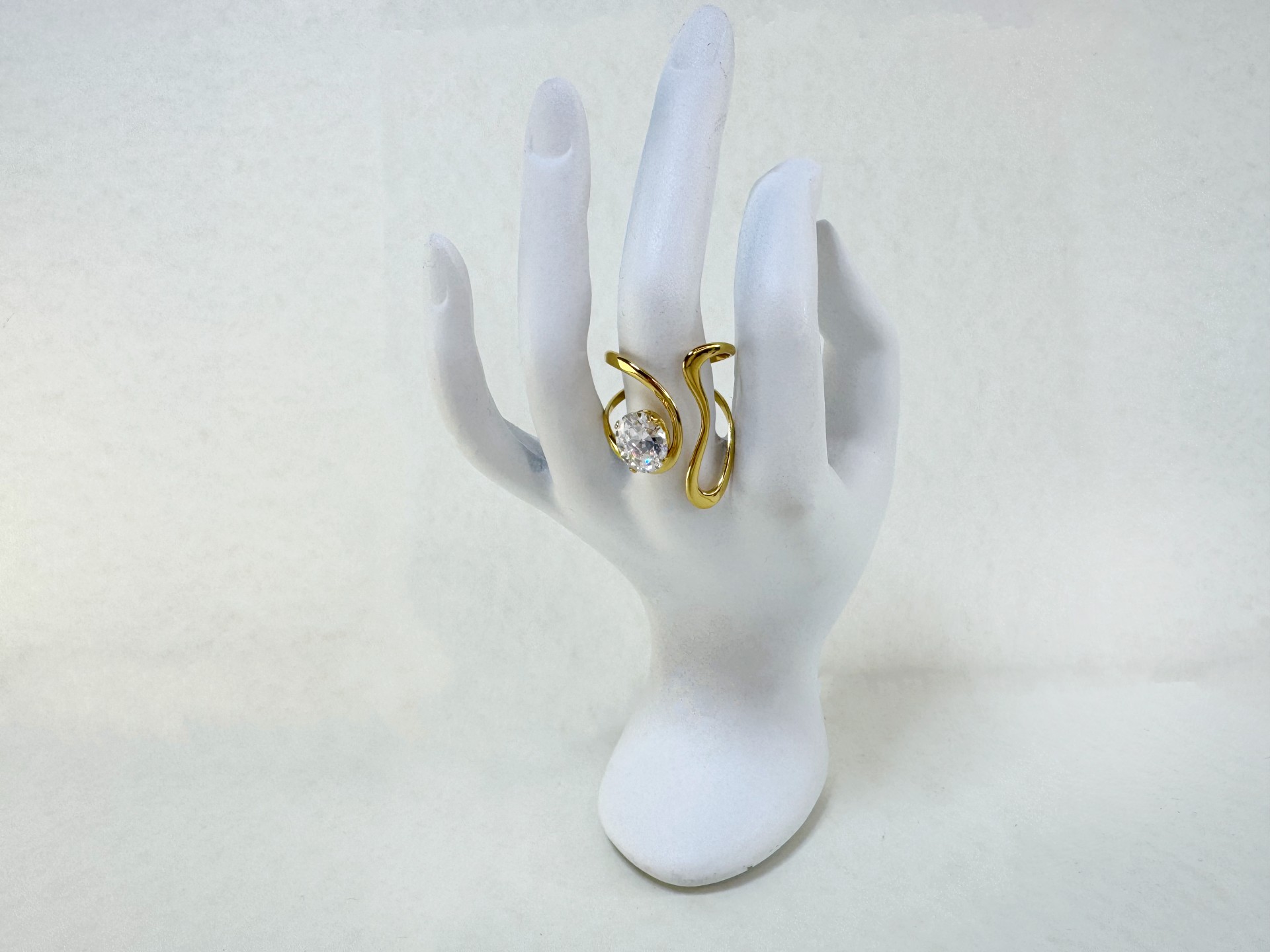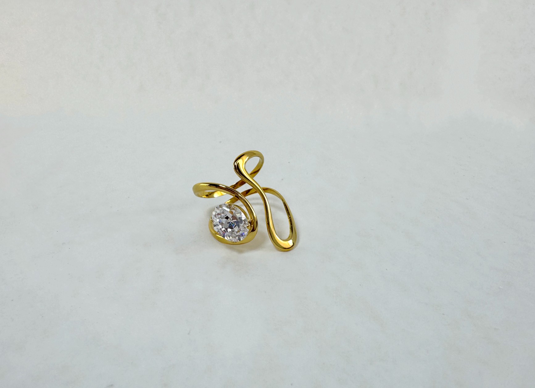 Οι ρευστές, καμπυλωτές γραμμές αγκαλιάζουν το δάχτυλο δημιουργώντας ένα γλυπτικό αποτέλεσμα, ενώ η λαμπερή κεντρική πέτρα λειτουργεί σαν σημείο φωτός που τραβάει όλα τα βλέμματα.